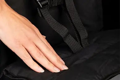 easily removable, plush liner with a 3-point safety harness and a storage pocket for easy access of travel documents.